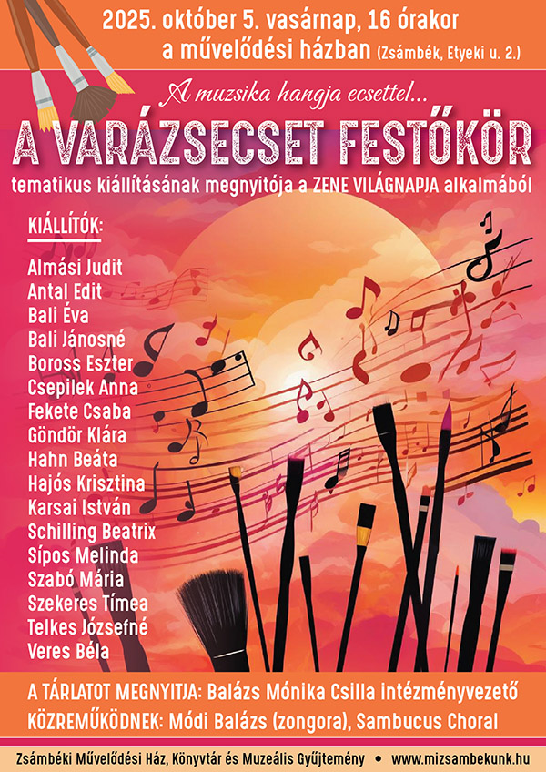 A Zsámbékon Csepilek Istvánné Anna vezetésével 9 éve működő amatőr, önképző festőkör csoportos tárlata évi rendszerességgel számot ad munkájáról. Az idei kiállítás képei a tavalyihoz hasonlóan meghatározott tematika alapján készültek erre az alkalomra, a ZENE VILÁGNAPJA alkalmára. A projektet Zsámbék Város Önkormányzata támogatta.
