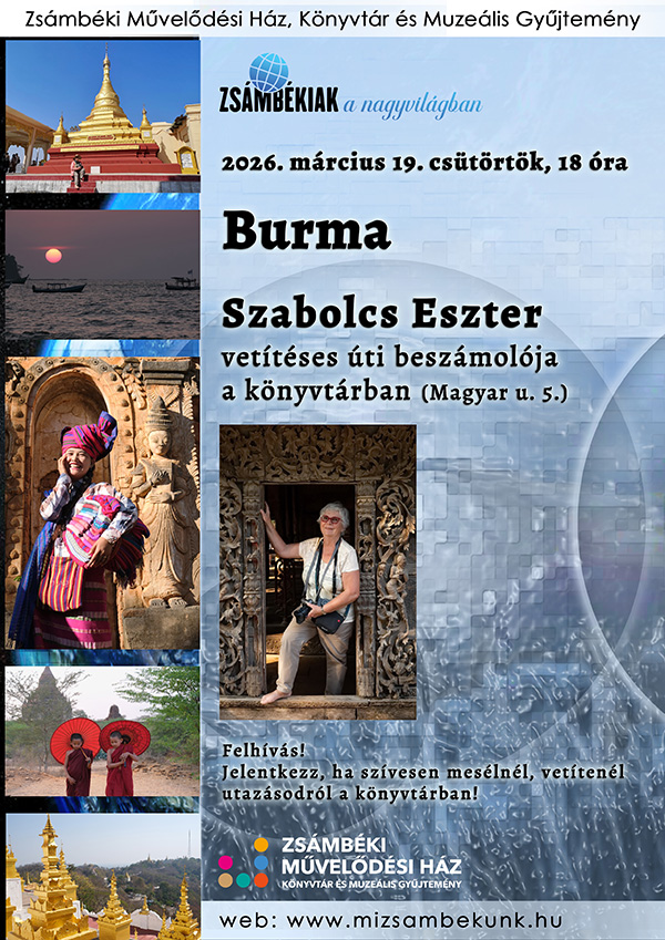 Népszerű vetítéses úti beszámoló sorozatunk virtuális utazásának úticélja ezúttal BURMA, SZABOLCS ESZTER egzotikus utazásának színhelye, aki megosztja velünk élményeit és gyönyörű fotóit a zsámbéki könyvtárban.