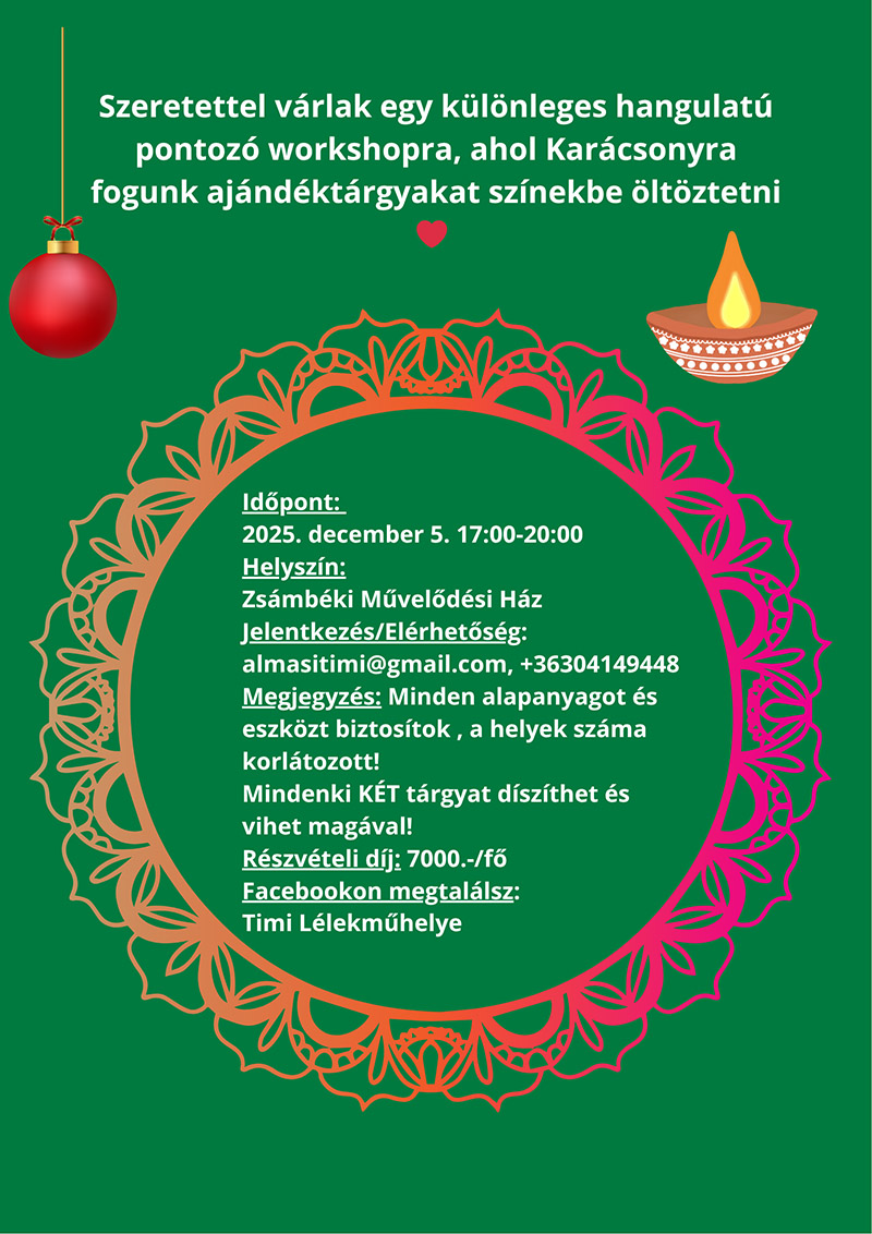 Print Email PONTOZÓ WORKSHOP 2025. december 5. péntek, 17-20 óraPONTOZÓ WORKSHOP Szabó Almási Tímea vezetésével a művelődési házban