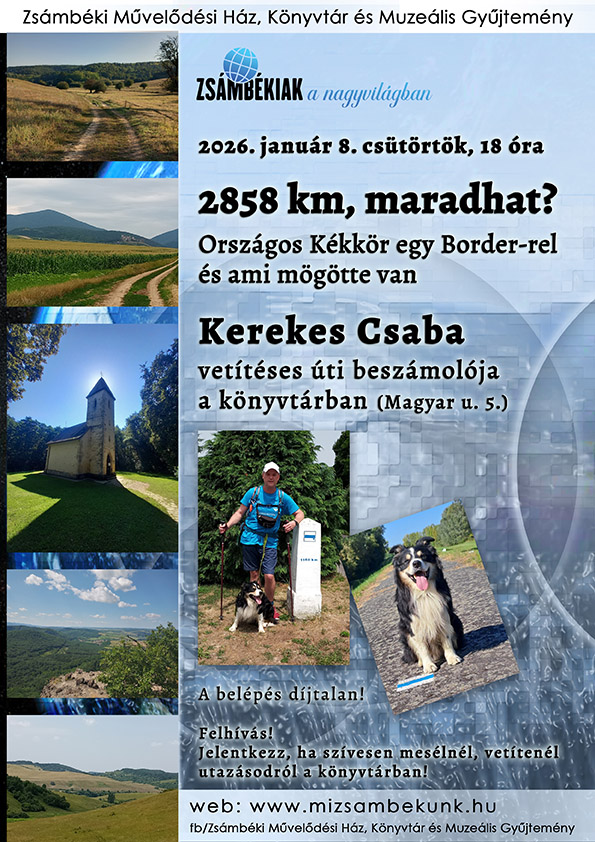 Népszerű vetítéses úti beszámoló sorozatunk virtuális utazásának témája ezúttal nem egy konkrét célállomás, hanem maga az út: az ORSZÁGOS KÉKKÖR, amit KEREKES CSABA nem is egyedül, hanem hűséges barátjával és túratársával, HERCEG nevű border collie-jával tett meg.