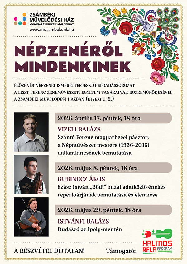 Elsőként a Zsámbékon élő Vizeli Balázs, kiváló prímás és egyetemi tanár lesz előadónk, aki legfőbb partnerünk a népzenei programok szervezésében. Védnöke és rendszeres fellépője az immár 5. évadát élő Gólyafészek Családi Táncháznak, és Gubinecz Ákossal, valamint Istvánfi Balázzsal együtt oktatóként is részt vesz a művelődési házban idén harmadszor meghirdetett "dudás" népzenei mesterkurzuson és népzenei táborban. A velük kialakult jó kapcsolat és a tartalmas, értékes együtt töltött idő alapozta meg az ötletet és igényt, hogy tudásukat ne csak a zenészek és énekesek, hanem a laikusok, az egyszerű népzenét kedvelő közönség is élvezhesse. Erre szeretnénk lehetőséget teremteni a NÉPZENÉRŐL MINDENKINEK című program segítségével, ahol az elméleti előadások mellett élő népzene teszi teljessé az élményt.